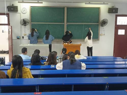 此次比赛分为钢笔字、粉笔字和毛笔字三个板块,其中钢笔字已经由各班学委收齐并上交。首先,主持人宣布比赛规则、此次比赛的目的及意义并宣布比赛正式开始。之后,参加粉笔字的同学按照名单顺序,四人一组到黑板上进行书写。与此同时,毛笔字比赛也一并展开。此次比赛的参赛选手书写十分流畅,字体具有特色,选手们也注意到从笔法、字法和章法三个方面提升和完善书写。最后,主持人宣布比赛结束,参赛选手先行离场,评委在对毛笔字评分完毕后离场。