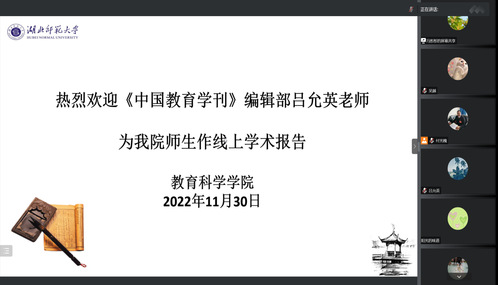 2022年11月30日下午,《中国教育学刊》编辑、副编审吕允英老师应邀在线为公司师生开展主题为“教科研及论文写作的几点建议”的专题讲座。此次讲座由公司副经理付光槐教授主持。