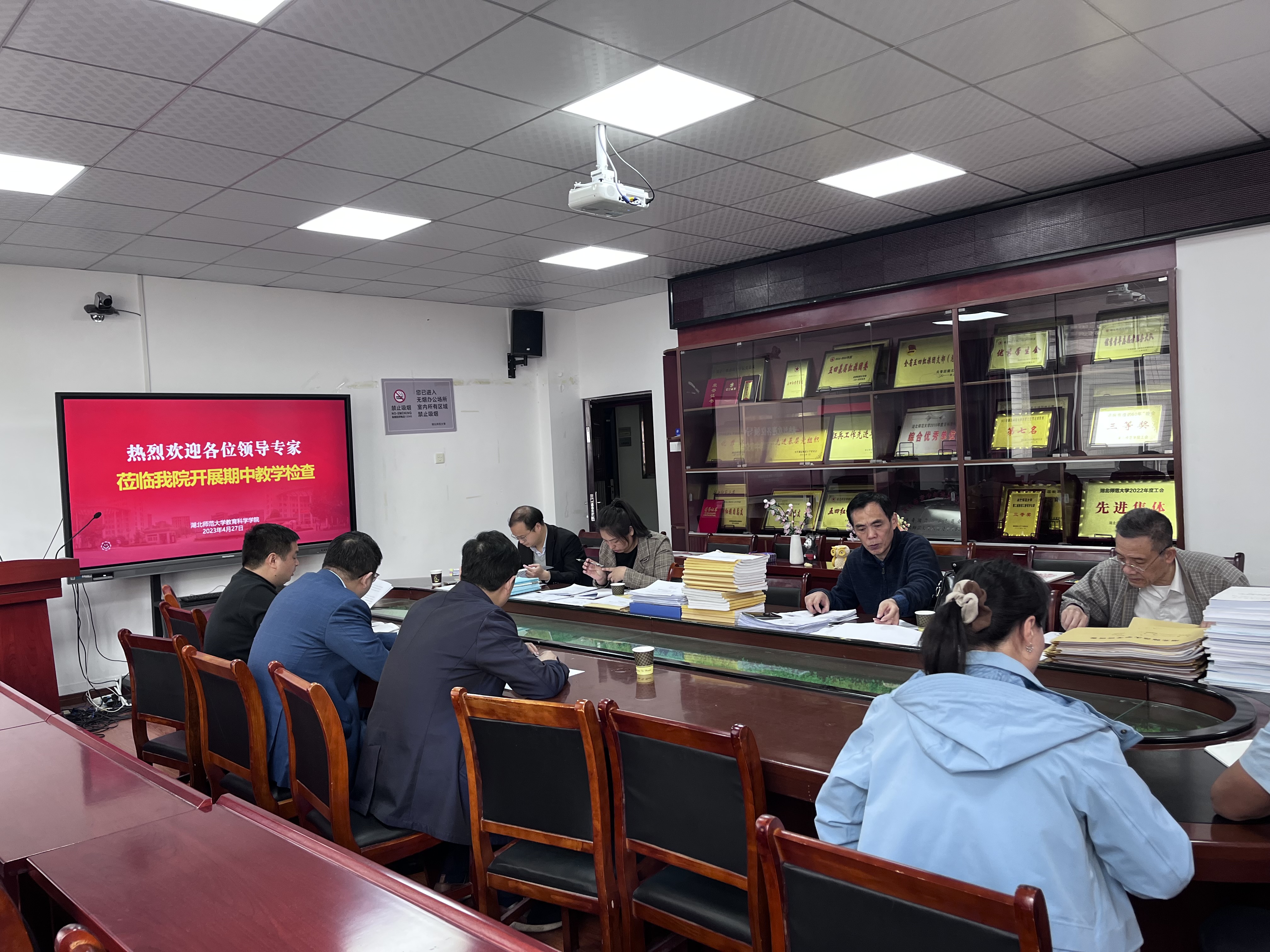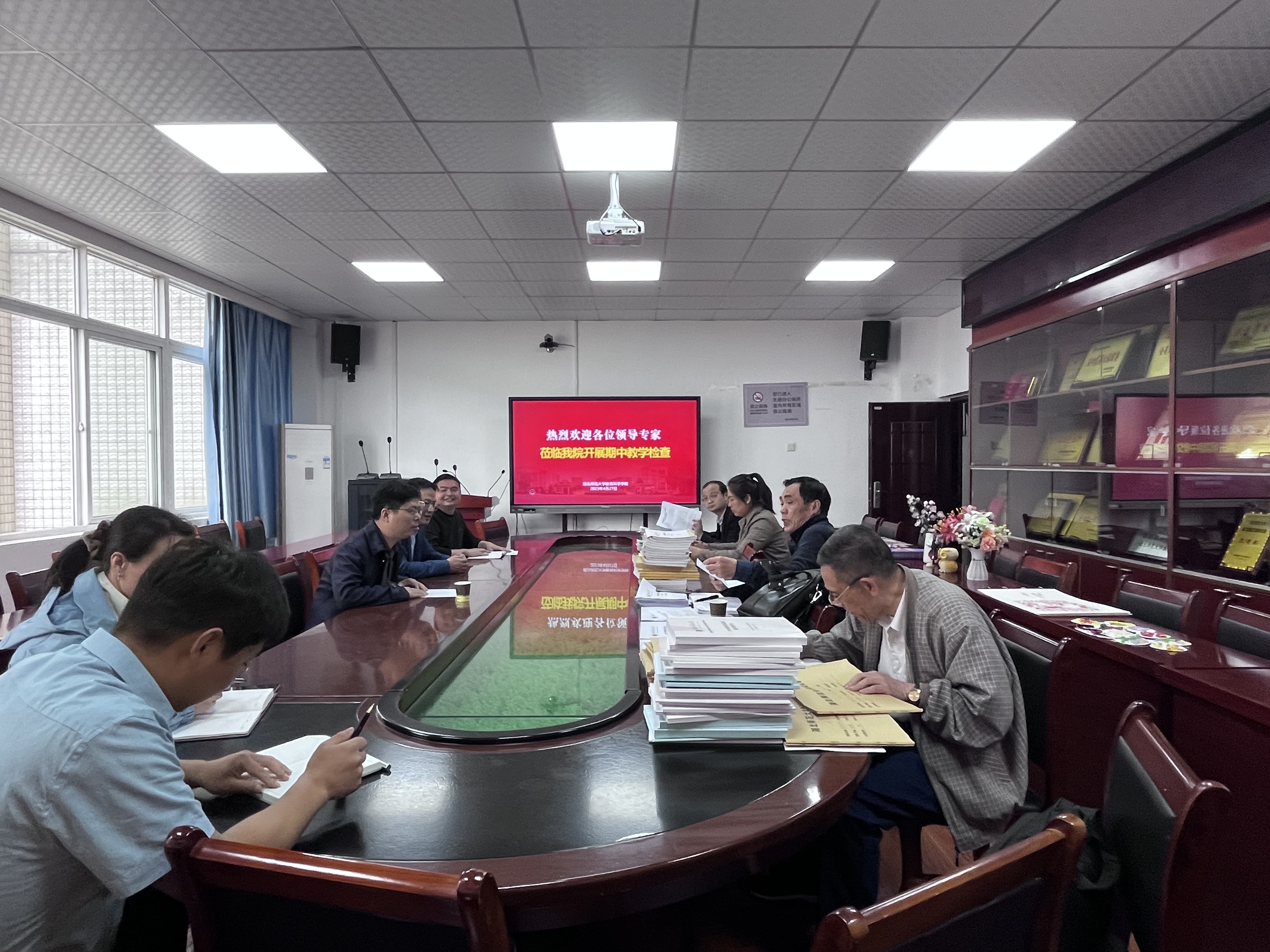其次,副经理崔波从马工程教材、课程考核、语言文字、学风建设、学籍异动、教学日志、同行听课、特色教学、一流课程、实验室安全等十个方面向检查小组汇报了本学期本科生教学工作情况。