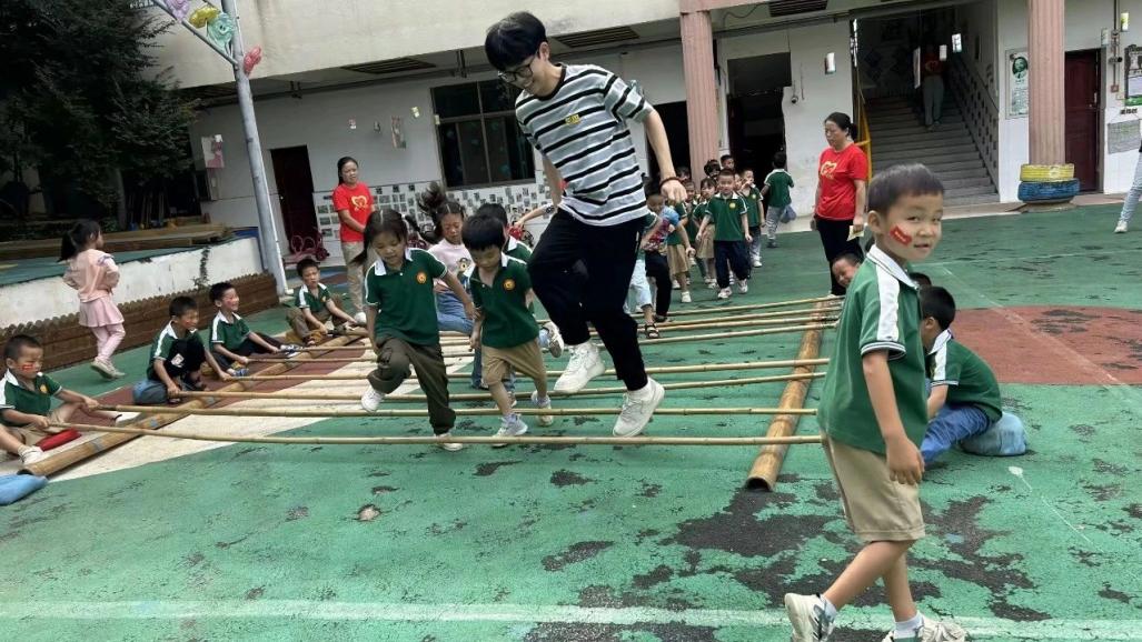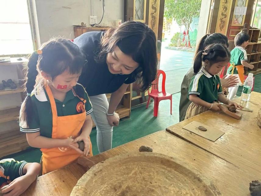 活动过程中,志愿者团队与老师们共同参与幼儿自主游戏观摩与现场研讨,观看了泥塑课程及竹竿舞的开展情况,志愿者团队还跟着孩子们一起跳起竹竿舞,与幼儿、老师进行积极的互动与交流。