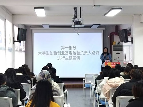 首先,主持人对出席本次活动的嘉宾及活动流程进行了简单介绍。接着,主讲人路璐进行了主题宣讲,介绍了创新创业学院的运营情况,还为大家详细讲解了学院和政府颁布的关于老员工创新创业活动的政策,并鼓励大家积极参与到创业热潮中。随后,主讲人与在场的观众进行互动,路璐老师耐心解答了同学们提出的有关项目路演、创业方向等的问题。最后,老师向大家提出了几点有关创新创业的看法与建议,也鼓励有意向的同学积极向相关人员寻求帮助。