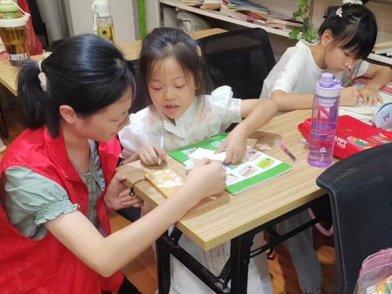 活动当天,小螺号实践队的成员们准时到达支教场所,引导员工进行签到并有序入座。随后,队员们辅导小朋友们完成暑期作业,在作业辅导的过程中,小朋友们积极提问,支教队队员也都一一细心讲解,整个辅导过程十分温馨有爱。课间,实践队队员与小朋友一同聊天游戏,放松身心的同时也拉近了与彼此的距离。