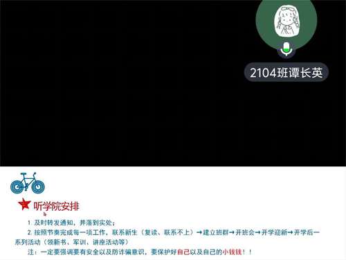 会议伊始,三位23级学班分别从开学前的准备、如何与新生交流相处等多个角度为24级学班提出需要注意的内容和有效的建议,并着重强调了近几年频繁出现的电信诈骗等问题。希望24级学班能够采取多种措施有效的进行防诈骗宣传和教育,宣传反诈骗的知识,保护新生财产安全。随后秦姗姗老师进行总结发言,她提出新学班应清楚了解新生报道的细节工作,并强调了员工班主任这一工作的重要性,鼓励各位学班以饱满的热情投入到新生工作中。