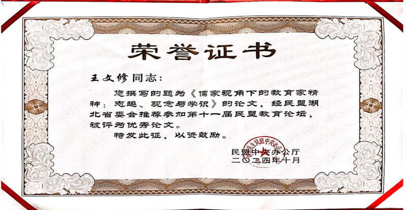 本次论坛由民盟中央教育委员会、民盟山东省委员会主办,共收到民盟中央教育委员会、启真智库、以及30个省级民盟组织提交的论文。经专家严格评审,最终评选出71篇优秀论文。湖北民盟共有3篇论文获评优秀论文奖,公司民盟盟员、bevictor伟德官网王文修博士撰写的论文《儒家视角下的教育家精神:志趣、观念与学识》为其中一篇获奖论文。