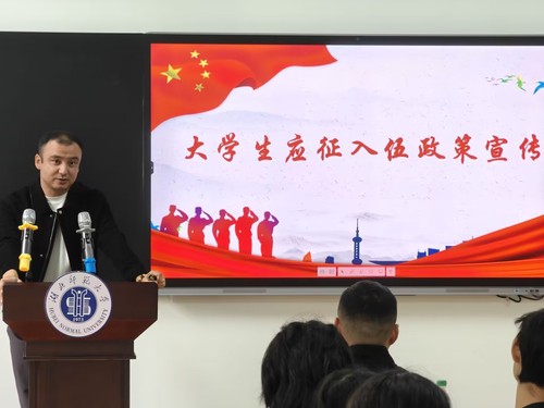 活动伊始,主持人简雅雯作开场白,介绍到场嘉宾,并讲述了活动目的,希望同学们从活动中汲取力量,歌颂爱国情怀。紧接着,何勇上台讲述个人在部队的生活,分享军旅生涯的收获与成长,传播军旅文化,并针对目前反间谍诈骗活动作出指引告诫。随后,伊力扎提宣讲征兵政策,为在场同学详细地介绍了参军入伍的流程,以及参军政策,鼓励同学们踊跃参军。秦姗姗进行总结发言,鼓励同学们积极参军入伍为国争光,磨砺人生。最后,所有人员共同拍照留念。