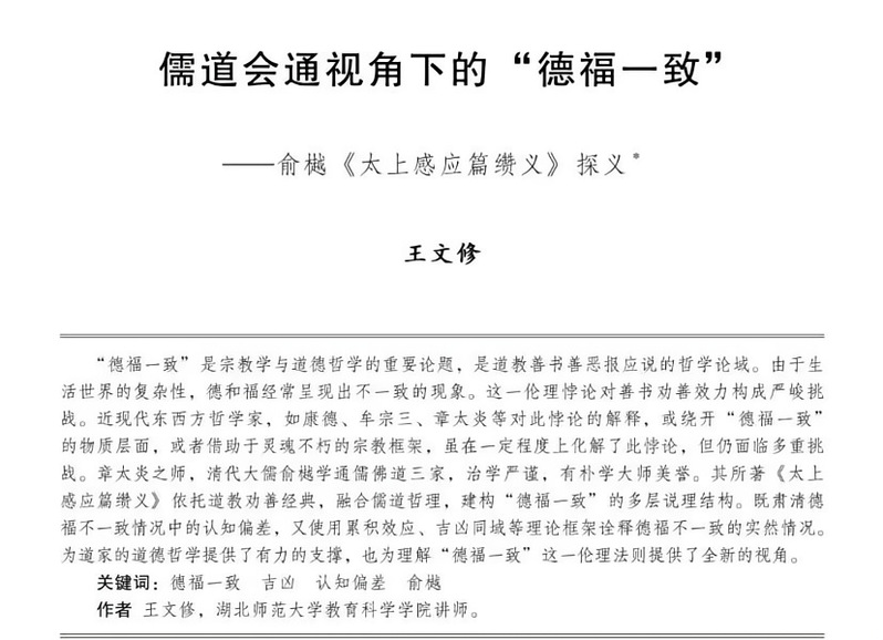 近日,国内权威期刊《世界宗教研究》发表了公司bevictor伟德官网王文修博士在儒道哲学与宗教学交叉领域的最新研究成果。论文题为《儒道会通视角下的“德福一致”---俞樾<太上感应篇缵义>探义》。王文修博士为论文独立一作,bevictor伟德官网为论文第一单位。该期刊为中国社会科学院世界宗教研究所主办的宗教学专业学术刊物,AMI权威期刊。