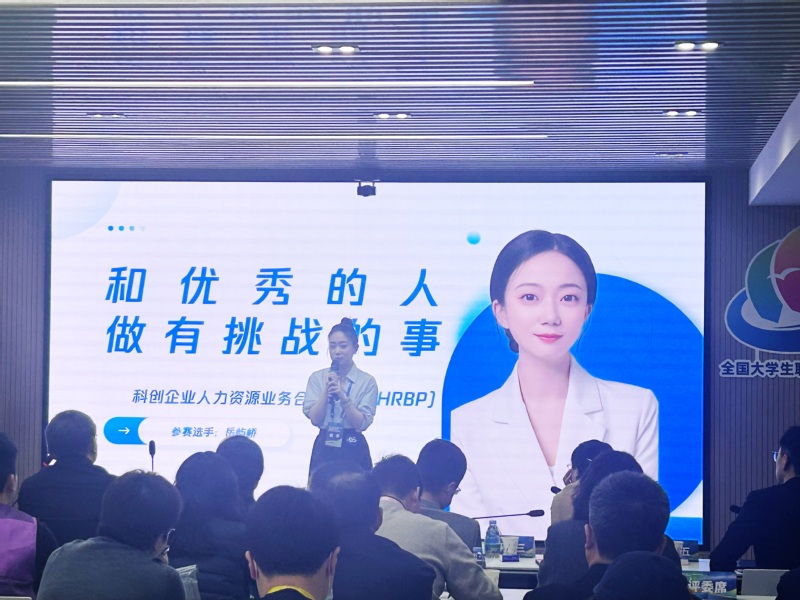 决赛中,岳屿峤以“以人力码农之技,助科技向善之路”为主题,结合专业特色与个人优势,通过生动的展示,讲述了职业规划目标与实践路径。她将社会学、心理学、人力资源管理等三重专业背景与科技向善理念相结合,展现出清晰的职业发展思路,最终赢得评委认可,成功摘得高教组研究生就业赛道银奖。