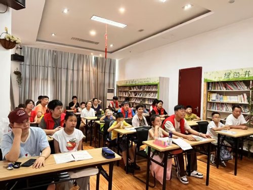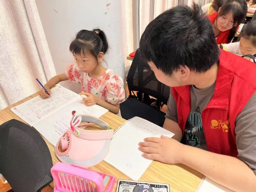 开班典礼结束后,开始正式上课,实践队员们化身“小老师”,全身心投入暑假作业辅导中。孩子们纷纷拿出语文、数学、英语等暑期作业,也有少部分的小朋友选择字帖练习或课外读物阅读。托管班涵盖一至八年级员工,队员们根据不同年龄段特点因材施教——针对低年级孩子识字量有限的问题,他们手持草稿纸示范书写,细致讲解汉字的含义与用法。对于中高年级员工,则为其提供个性化作业辅导,确保每个孩子都能得到适宜的学业指导。