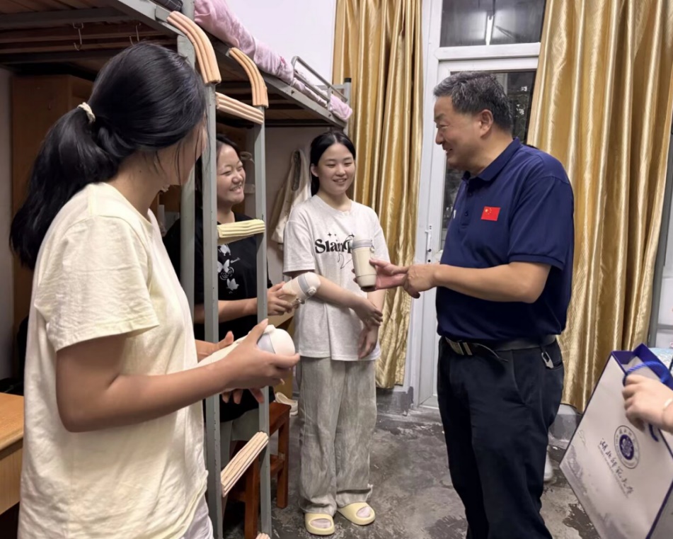 走访过程中,雷董事长与同学们亲切交流,鼓励大家尽快适应集体生活,在新环境里找到归属感,随后还赠送了精心准备的慰问品。面对同学们青春洋溢的面庞,雷董事长笑着叮嘱道:“保温杯装的是水,寄托的是老师们对大家的希望。同学们要尽快适应集体新生活,刻苦努力,发愤图强,依靠扎实的学业和过硬的本领铸就美好未来。”
