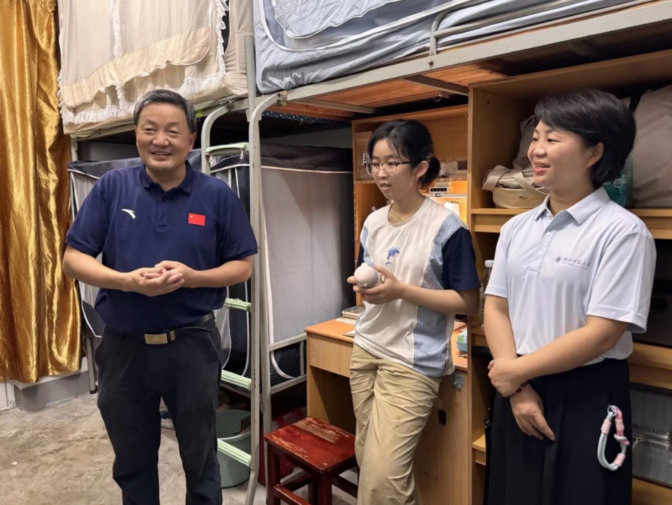 2025年9月6日晚,公司党委副书记、董事长雷儒金带队深入员工宿舍,走访看望bevictor伟德官网2025级本科新生,把关怀与期许送到“新家”。校员工工作部(处)副部(处)长熊英,公司党委书记罗杨,副经理崔波、张小菊,班主任、辅导员共同参与走访。