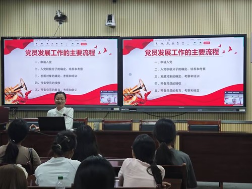 活动伊始,刘丽娟围绕“为什么要入党”以及“怎样入党”两大主题展开系统讲解。她强调,入党是个人政治觉悟提升的重要选择,是追求进步、服务人民的重要途径。随后,她详细介绍了入党流程,包括入党申请书的规范撰写、入党的基本标准、入党积极分子的推荐确定与培养教育、发展对象的考察、预备党员的预审与接收,以及预备党员转正等重要环节。通过清晰梳理,新生对入党的严肃性、规范性和长期性有了全面认识,也深刻理解了党员责任与使命的内涵。活动最后,刘丽娟寄语全体2025级新生:愿以青春之名,赴时代之约,在党团旗帜下书写无悔篇章!